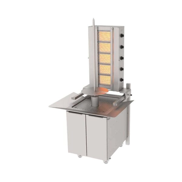 ·         LPG’li ve NG seçenekleri mevcuttur.   ·         Emniyet ventili kontrol dışı sönen radyanlara giden gazı otomatik   olarak keser.   ·         Isıtıcı yüzeyi geniş olması sayesinde hızlı servis imkanı sağlar.   ·         Hareketli araba sayesinde kolay et sarma imkanı.   ·         Alttan motorludur.   ·         şiş yatağı sayesinde üst tutucu profil yoktur. Hijyenlik sağlar.   ·         Manuel kesim imkanı.   ·         Üst gövde ileri geri hareket eder.   ·         Ocakların radyan korumaları çubuk ızgara tipinde gönderilir. Atalay Döner Ocağı; ·         Stok Kodu: ADG – 5 D   ·         Radyan Sayısı: 5   ·         Gerilim: 220-240 V   ·         Güç Sarfiyatı-LPG: 1.180 kg/h   ·         Güç Sarfiyatı-NG: 1.795 m3/h   ·         kW -LPG: 15   ·         kW – NG: 17   ·         Kilokalori-LPG: 12900   ·         Kilokalori – NG: 14617   ·         Net Ölçüler: 1030x1250x2090 mm   ·         Ölçüler/Tepsisiz: 780x875x2090 mm   ·         Net Ağırlık: 133 kg
