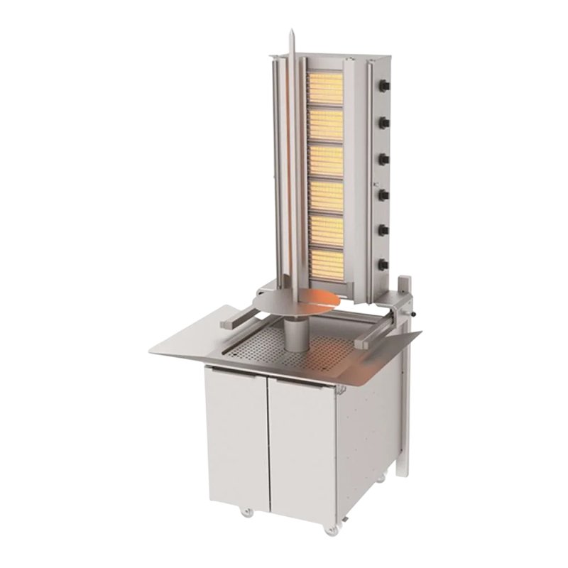 · LPG’li ve NG seçenekleri mevcuttur. · Emniyet ventili kontrol dışı sönen radyanlara giden gazı otomatik olarak keser. · Isıtıcı yüzeyi geniş olması sayesinde hızlı servis imkanı sağlar. · Hareketli araba sayesinde kolay et sarma imkanı. · Alttan motorludur. · şiş yatağı sayesinde üst tutucu profil yoktur. Hijyenlik sağlar. · Manuel kesim imkanı. · Üst gövde ileri geri hareket eder. · Ocakların radyan korumaları çubuk ızgara tipinde gönderilir. Atalay Döner Ocağı; · Stok Kodu: ADG – 6 D · Radyan Sayısı: 6 · Gerilim: 220-240 V · Güç Sarfiyatı-LPG: 1.062 kg/h · Güç Sarfiyatı-NG: 1.524 m3/h · kW -LPG: 13.5 · kW – NG: 14.4 · Kilokalori-LPG: 11610 · Kilokalori – NG: 12384 · Net Ölçüler: 1030x1047x2250 mm · Ölçüler/Tepsisiz: 780x875x2250 mm · Net Ağırlık: 143 kg