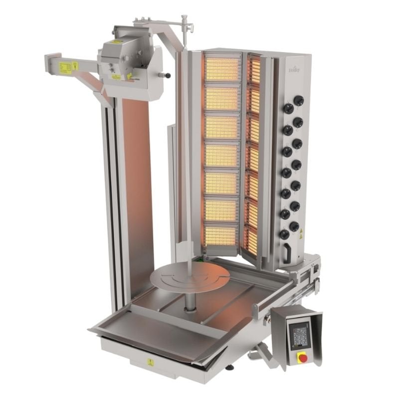 · Patentli hareketli mastar gerçek döner yüzeyi profilini tespit ve takip eder. Böylelikle sürekli kesim imkanı sağlanır. · Döner yüzeyini analog olarak okuduğu için yüzey tespit hassasiyeti yüksektir. · Patentli hareketli mastar mekanik bir aksam olduğu için arıza verme olasılığı düşüktür. · Hareketli mastar okuyucu ünite ısıdan uzak bir bölgeye konulduğu için sıcaklığın olumsuz etkilerine maruz kalmaz. · Patentli şiş yuvası; Patentli özel tasarımı sayesinde döner şişinin sıfır boşluklu bir şekilde yuvaya oturmasını ve zaman içerisinde boşluk değerinin değişmeden korunmasını sağlar. · Bu da dönerin kesimi sırasında kesilen girişlerin doğru konumlanması anlamına gelir. · Ayrıca konik yapısı sayesinde şişin kolay konumlandırılması sağlanır. · Açısal pozisyonlamaya gerek yoktur. · Elektrik kesintisi veya makinenin çalışmadığı durumlarda, döneri indirmeye gerek kalmadan manuel döndürme pozisyonuna alınabilir. · Tepsiler ve koruyucu plakalar; Temizlik işlemi sırasında her bir parçası çıkartılarak kolay bir şekilde temizliğin yapılması sağlanır. · Döner alt firesiz kesim; Dönerlerin alt kısmında kalan, kesilemeyen bölgenin kesilme imkanı sağlanır. · Bıçak kullanım ömrünü arttırmak için dünyada ilk çap küçüldüğünde bıçak öteleme özelliği vardır. ideal kesim formu için bıçak açısı ayarlanabilir özelliktedir. · Ø140 mm. dairesel bıçak ile geniş kesim imkanı. · Sürekli kesim; Sürekli kesim özelliği kesim hız ayarı entegrasyonu sayesinde her turda durmadan kesim yaparak süre ve enerjiden tasarruf sağlar. · Otomatik ocak hareket mekanizması; Kayar yataklama ve zincir dişli hareket mekanizması sayesinde bakım gerektirmez. · Dış ortam şartlarına karşı korunaklıdır. ideal döner takip mesafesinin korunmasını sağlar. · (Opsiyonel bir özelliktir. Standart Makine ile birlikte gelmez.) · Geniş kesim robotlar için kesim genişliği ölçüsü maksimum 12 cm.’dir. · Çoklu dil seçeneği 8 adettir. Atalay Döner Robotu; · Stok Kodu: ADR-14G-GK · Radyan Sayısı: 14 (7×2) · Üst Derinlik: 142 cm · Genişlik: 127 cm · Yükseklik: 192 cm · Tepsi Yok iken Derinlik: 93 cm · Tepsi Var iken Derinlik: 135 cm · Alt Makine Genişlik: 75 cm · Döner Çapı: Ø56 – Ø62 cm · Maksimum Döner Yüksekliği: 116 cm · Ortalama Et Ağırlığı (+/- %5): 350 kg · Döner Bıçak Çapı: Ø200 mm · Güç Sarfiyatı (LPG): 2.478 kg./h · Güç Sarfiyatı (NG): 2.934 m3/h · Güç Sarfiyatı (LPG): 33.6 kW · Güç Sarfiyatı (NG): 31.5 kW · Güç: 120-400 W · Besleme Gerilimi: 230 V/50-60 Hz · Net Ağırlık: 255 kg