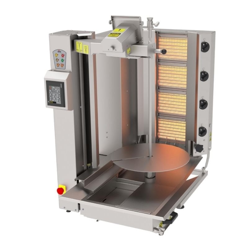 · Hijyenik ve el değmeden kesim yapabilme özelliği. · istenilen kalınlıkta ve sürekli döner kesimi yapabilir. · Patentli şiş yataklama mekanizması sayesinde sıfır boşluk, hassas açı konumlama ve manuel döndürme özelliğine sahiptir. · Patentli yüzey takip aparatı sayesinde hatasız döner yüzeyi algılama özelliği. · Kullanımın basit olması ve herhangi bir tecrübeye ihtiyaç duyulmaması. · Çıkarılabilir parçalar sayesinde kolay ve hızlı temizlik imkanı Otomatik makinalarda temizlenebilme özelliği. · Dokunmatik ekran sayesinde kesim genişliği seçebilme özelliği. · Temizlik sırasında radyanların zarar görmemesi için koruma sacının bulunması. · Döner pişirme dönme hızı ayarlayabilme özelliği. · Sökülebilir raylı ve süzgeçli et haznesi. · Kesim genişliği, bekletmeli ve sürekli kesim özelliği. · ileri geri hareket eden ve açısı ayarlanabilen döner ocağı. · Kesilen etin sıcaklığını muhafaza etmek için ısıtıcı ünite. · Bıçak bileme modu. · Etin yüzeyine ayarlanabilir baskı özelliği. · Gazlı ve elektrikli tip döner ocağını, cihaza kolaylıkla adapte edebilme özelliği. · Kolay ocak temizleme için konumlama özelliği. · Compact tasarım. · LPG’li ve NG seçenekleri mevcuttur. · Çoklu dil seçeneği 8 adettir. Atalay Döner Robotu; · Stok Kodu: ADR-C1-4G · Radyan Sayısı: 4 · Üst Derinlik: 92 cm · Genişlik: 72 cm · Alt Derinlik: 86 cm · Yükseklik: 109 cm · Döner Çapı: Ø45 cm · Maksimum Döner Yüksekliği: 72 cm · Ortalama Et Ağırlığı (+/- %5): 90 kg · Döner Bıçak Çapı: Ø140 mm · Güç Sarfiyatı (NG): 1.016 m3/h · Güç Sarfiyatı (LPG): 0.708 kg./h · Güç Sarfiyatı (NG): 9.6 kW · Güç Sarfiyatı (LPG): 9 kW · Güç: 120-400 W · Voltaj: 220-240 V/50-60 Hz · Net Ağırlık: 150 kg