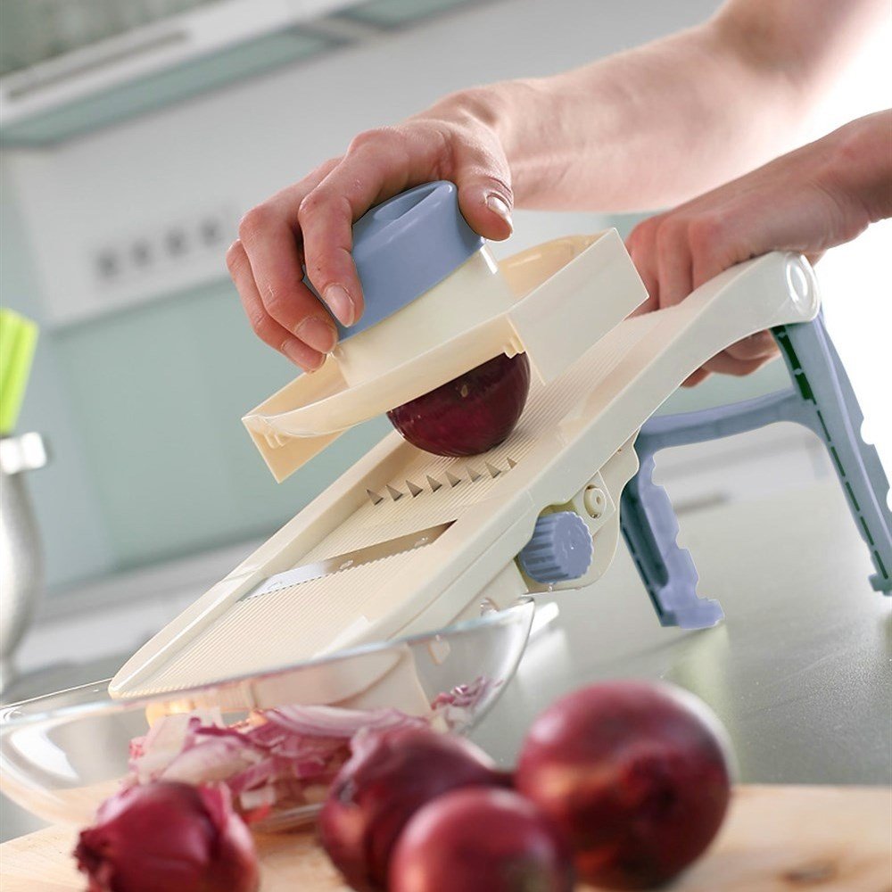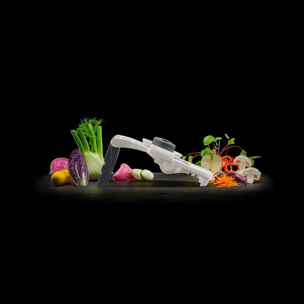 Pratik ve keskin üç değiştirilebilir bıçağa sahiptir. Düz kesim için düz bir bıçak, kafes ve dalgalı kesim için tırtıklı ve, ince jülyen şeritler için ise jülyen bıçak içerir. Parmaklarınızı korumak için gıda kavrama aparatı ile güvenli bir şekilde çalışmanızı garanti eder.