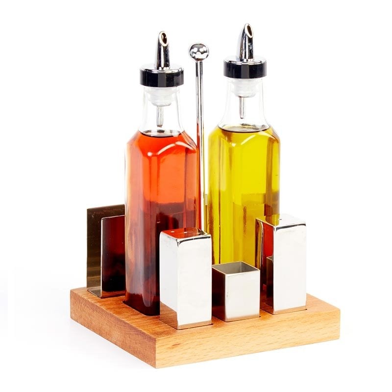 - 2 adet cam yağlık, 2 ader çelik baharatlık, 1 kürdanlık ve 1 peçetelikten oluşur.