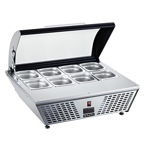 By Kitchen DSS-67 Set Üstü Soğuk Teşhir Ünitesi, 1/6GN, kompakt tasarımının yanı sıra 8 adet 1/6 GN bölmesiyle işletmenizde hem etkili alan kullanımı hem de geniş ürün çeşitliliği sunar.