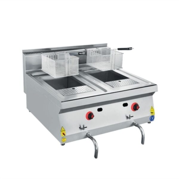 · Lpg ve Ng ile çalışabilme özelliği. · Magnet emniyet ventilli musluklar. · Paslanmaz çelik sepetler. · Tahliye musluğu ile emniyetli yağ boşaltma. · Limit termostat. · Kolay temizlenebilir ve hijyeniktir. · Paslanmaz çelik gövde. CSA Set Üstü Fritöz · Ölçüler: 800x700x300 mm · Enerji: 20 mbar · Güç: 16,121 kW · Kapasite: 10+10 lt · Ağırlık: 52.5 kg