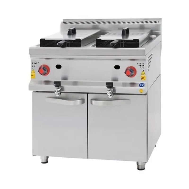 CSA 900 Seri Fritöz Dolaplı Doğalgazlı 22+22 lt 80×90 Cm · Lpg ve Ng ile çalışabilme özelliği. · Magnet emniyet ventilli musluklar. · Paslanmaz çelik sepetler. · Tahliye musluğu ile emniyetli · yağ boşaltma. · Limit termostat. · Kolay temizlenebilir ve hijyeniktir. · Paslanmaz çelik gövde. CSA Dolaplı Fritöz