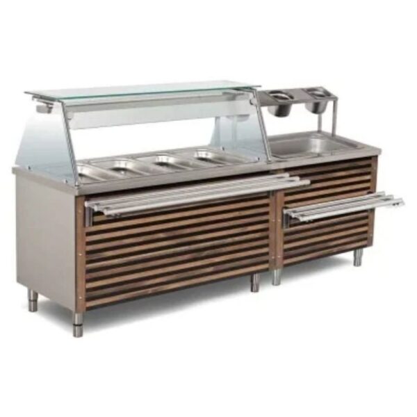 · Termostatik kumanda. · 220V 50 Hz enerji. · Paslanmaz çelik havuz. · Su tahliye vanası. · Aydınlatma Sistemi. · Paslanmaz çelik gövde. Empero Servis Ünitesi Teknik Özellikleri; · Ebatlar(mm): 1800x790x850/1350 · Ağırlık(kg): 118 · Net(m3): 1.8 · Kapasite: 4 Sıcak+1 Nötr