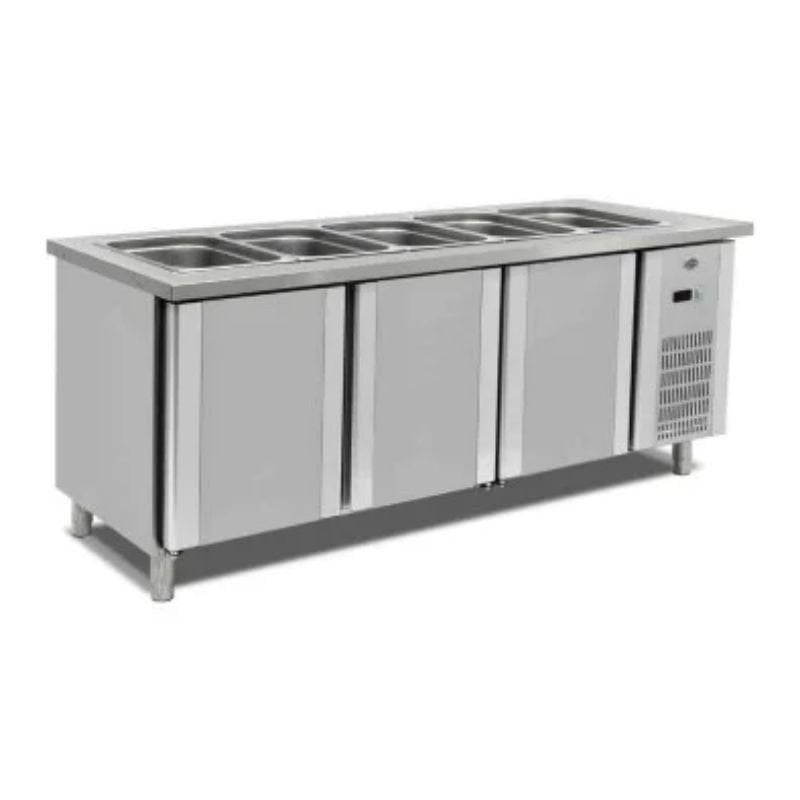 Empero EMP.BSS.20 Soğuk Servis Ünitesi Buzdolaplı 3×1/1 Gn · Çalışma aralığı 0/+5 ºC (tropikal 43 ºC) · 220-230V -1 +N 50-60 Hz elektrik gücü. · “CFC Free” R-134 A soğutucu gaz. · 40 kg/m³ yoğunluk. · Sıcaklık ve defrost kontrollü dijital gösterge. · Defrost esnasında otomatik su buharlaştırma. · Fanlı soğutma. · 48 mm kalınlığında “ozon dostu” poliüretan izolasyon. · 45 derecede sabit kendiliğinden kapanan kapılar. · Alüminyum panelli,bakır borulu evaparatör. · Ayarlanabilir, paslanmaz çelik raf yuvaları, plastik raflar. · Paslanmaz çelik gövde. · Opsiyonel ön ahşap giydirme. · Led aydınlatma. · Paslanmaz çelik gövde. Empero Soğuk Servis Buzdolaplı Ünitesi Teknik Özellikleri;