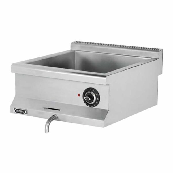 · Termostatik kontrol. · Tahliye musluğu. · Kolay temizlenebilir ve hijyeniktir. · Üst tabla kalınlığı 1.2 mm, gövde 1 mm paslanmaz çelik. · Kapasite; 1 adet 1/1 Gn + 2 adet 1/4 Gn · Elektrik Girişi: 230V AC N PE · Kablo Kesiti (mm2): 3×2,5 Empero Set Üstü Benmari Teknik Özellikleri; · Ebatlar(mm):600x635x285 · Ağırlık(kg):26 · Net(m3):0.17 · Güç(kw):3