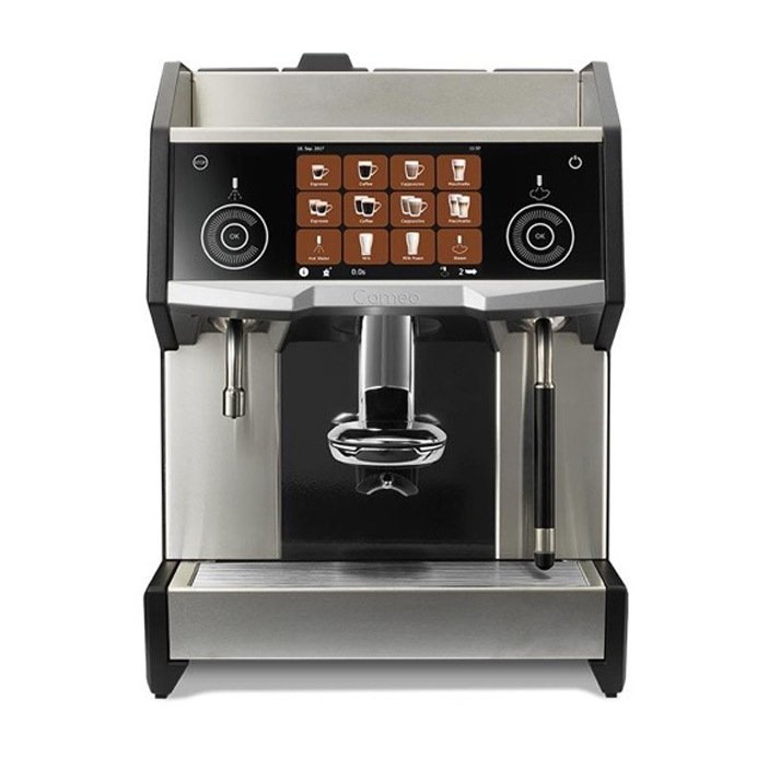 Eversys Cameo CLASSIC C’2MS – Tek Grup Süper Otomatik ESPRESSO Makinesi (Otomatik Süt Sistemli + Buhar Kolu + Sıcak Su Musluğu) – 1.6 Lt. buhar boyleri + 0,8 Lt. kahve boyleri – 1 adet ikili kahve çıkışı, 1 adet ikili süt çıkışı, 1 adet buhar çubuğu, 1 adet sıcak su musluğu – Sıcak su ısı kontrolü ve hassas dozajlama – Aynı anda iki ürün yapabilir – 2 adet dahili, 64 mm seramik bıçaklı, soğutma sistemli değirmen modülü (2 x 1.2 kg kapasite) – 24 gr. kapasiteye sahip kahve demleme haznesi – Toz kahve haznesi (Örn; kafeinsiz kahve) – e'Levelling teknolojisi ile sürekli aynı tutarlılıkta 'espresso tamp' işlemi – ETC teknolojisi ile her bir kahve için aynı tutarlılıkta kahve öğütümü, akışı ve süresi – EMT teknolojisi ile her bir ürün için farklı özelliklerde süt ayarlanabilir – 1.5 adım süt teknolojisi ile istenilen sıcaklığa ve krema yoğunluğuna sahip süt, tek tuşla musluktan alınabilir – 2 farklı süt kullanımı modülü – Everfoam teknolojisi ile süt sıcaklığı, krema yoğunluğu kolayca ayarlanabilir – Yüksek güçlü (Powerplus) buhar boyleri – Saatte 175 bardak espresso(23 sn.), 175 bardak cappuccino, 170 bardak sıcak su(200 ml) çıkartabilme performansı – 15.7'' büyüklüğünde kolay kullanımlı, dokunmatik ekran – Yüksekliği ayarlanabilir kahve grup başı, 165 mm maks. – Bardak ısıtıcı bölüm – Dahili 0.4 kg atık kahve posası çekmecesi – Telemetri uzak bağlantı teknolojileri ile; *Saatlik/günlük/aylık gerçek zamanlı, makine teknik/bakım istatistiklerine ulaşılabilir *Ürün kalite, istatistik ve reçetelerine ulaşılabilir *Satış istatistikleri ve stok takibini kolaylaştırır *Kolay, kişiselleştirilebilir, ödeme sistemleri entegrasyonu yapılabilir – Güç: 8,10 Elek. kW ~ 50/60 Hz AC 380/400V 3N – Boyutlar: 430 x 600 x 580 mm – Ağırlık: 62 kg – Earth ve tempest renk seçeneği