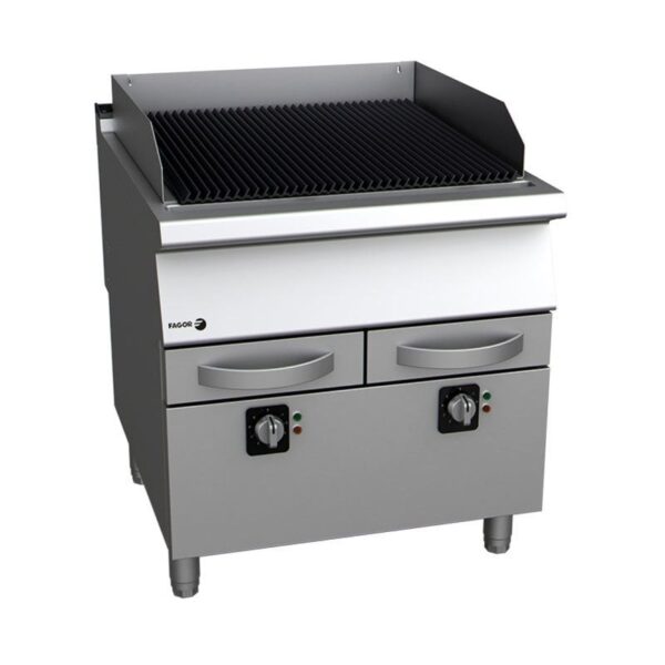 FAGOR B-G710 70 Lik Kore Seri Tam Modül Elektrikli Izgara 2 mm kalınlığında AISI-304 paslanmaz çelikten imal edilmiş tezgahlar, Demir ızgaralar çift taraflıdır ve iki tarafı da farklı bitişlere sahiptir: – Et pişirmek için ince çizgili nervürlü ve eğimli – Balık ve sebze pişirmek için yatay ve düz mutfak10.com Yağ toplama bölmelerine su dökülebilir ve gazlı brülör veya elektrikli rezistansların ısıyı yayması sayesinde düşük yoğunluklu bir buhar elde edilir ve ızgara buhar ortamında yapılır. GÜÇ: 8,6 kW BOYUT: 800×730×290 mm ELEKTRİK BAĞLANTISI: 400 V – 3N