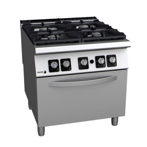 FAGOR Gazlı Kuzine, 4 Gözlü, 70’lik,7 Pozisyonlu Selektör 2 mm kalınlığında AISI-304 paslanmaz çelikten imal edilmiş gömme tezgahlar Üst panele yerleştirilmiş düğmeler ile, GN 2/1 boyutunda veya kullanımı kolay (OP versiyonu mutfaklar) 1000 x 700 x 290 mm boyutlarında statik fırın. mutfak10.com 7 pozisyonlu selektör aracılığıyla gücün ayarlanması ve her bir plaka için güvenlik termostatı