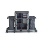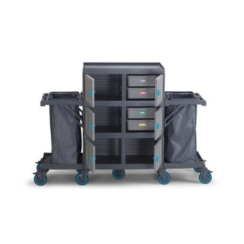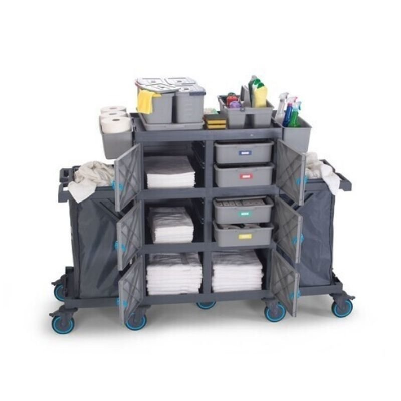 Tatil köyü, otel, hastane, okul, yurt gibi işletmelerin kat hizmetlerinde kolaylık ve standart sağlar. Fantom procart 453 çekmeceli dolaplı kat arabası, 2 çöp bölmeli . Rahatça hareket edebilen sessiz tamponlu ve frenli tekerlekleri sayesinde darbelere karşı dayanıklıdır. Frenli tekelleri sayesinde eğik düzlemlerde sabitleme imkanı sağlar. Opsiyonel aksesuarı ile atık bölmenizi 2 x 60 lt olarak kullanma imkanı sunar. Tüm gövde yapısının plastik olması sayesinde, iç ve dış mekanlarda kullanıma uygundur. Su ile yapılan temizliklerden hiçbir şekilde etkilenmez ve paslanma yapmaz. Ürünün hammaddesinde kimyasal maddelere ve ısıya dayanıklı Poli Propilen malzeme kullanılmıştır. www.mutfak10.com