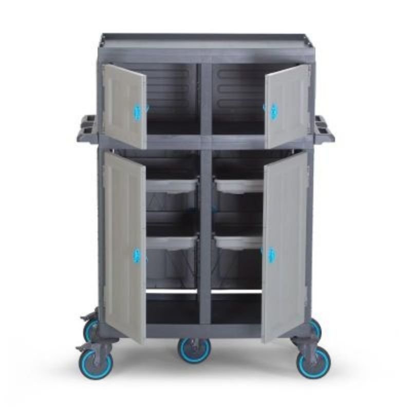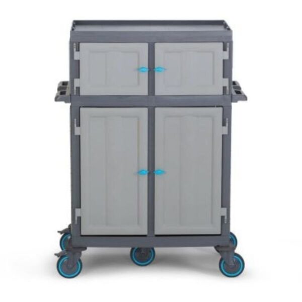 Tatil köyü, otel, hastane, okul, yurt gibi işletmelerin kat hizmetlerinde kolaylık ve standart sağlar. Fantom Procart 461 Çekmeceli Dolaplı Kat Arabası. Rahatça hareket edebilen sessiz tamponlu ve frenli tekerlekleri sayesinde darbelere karşı dayanıklıdır. Frenli tekelleri sayesinde eğik düzlemlerde sabitleme imkanı sağlar. Opsiyonel aksesuarı ile atık bölmenizi 2 x 60 lt olarak kullanma imkanı sunar. Tüm gövde yapısının plastik olması sayesinde, iç ve dış mekanlarda kullanıma uygundur. Su ile yapılan temizliklerden hiçbir şekilde etkilenmez ve paslanma yapmaz. Ürünün hammaddesinde kimyasal maddelere ve ısıya dayanıklı Poli Propilen malzeme kullanılmıştır. www.mutfak10.com