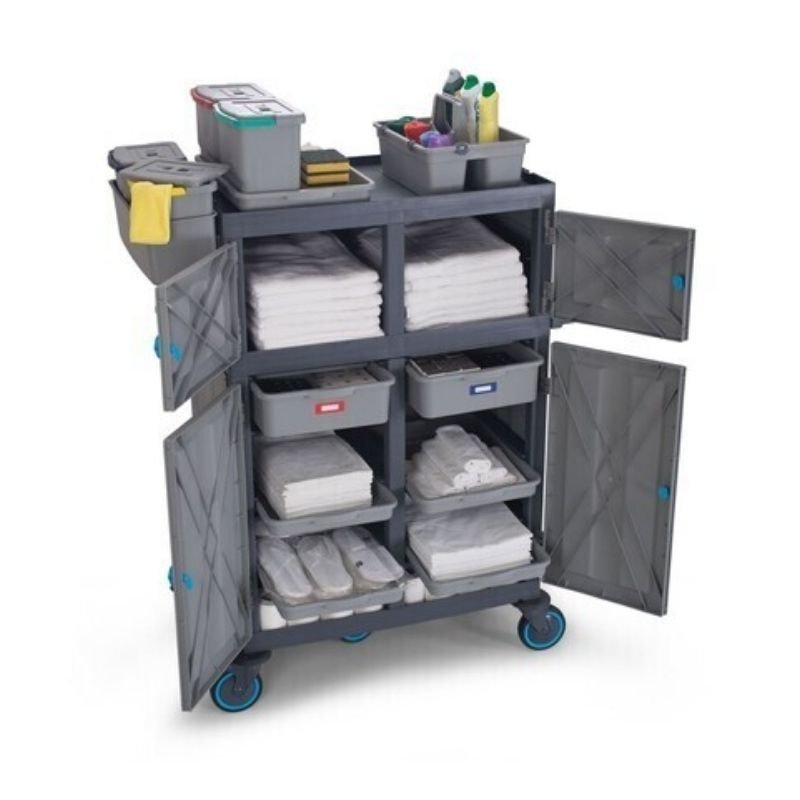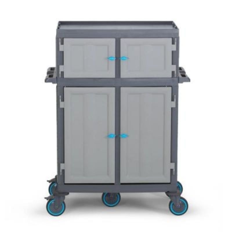 Tatil köyü, otel, hastane, okul, yurt gibi işletmelerin kat hizmetlerinde kolaylık ve standart sağlar. Fantom Procart 461 Çekmeceli Dolaplı Kat Arabası. Rahatça hareket edebilen sessiz tamponlu ve frenli tekerlekleri sayesinde darbelere karşı dayanıklıdır. Frenli tekelleri sayesinde eğik düzlemlerde sabitleme imkanı sağlar. Opsiyonel aksesuarı ile atık bölmenizi 2 x 60 lt olarak kullanma imkanı sunar. Tüm gövde yapısının plastik olması sayesinde, iç ve dış mekanlarda kullanıma uygundur. Su ile yapılan temizliklerden hiçbir şekilde etkilenmez ve paslanma yapmaz. Ürünün hammaddesinde kimyasal maddelere ve ısıya dayanıklı Poli Propilen malzeme kullanılmıştır. www.mutfak10.com