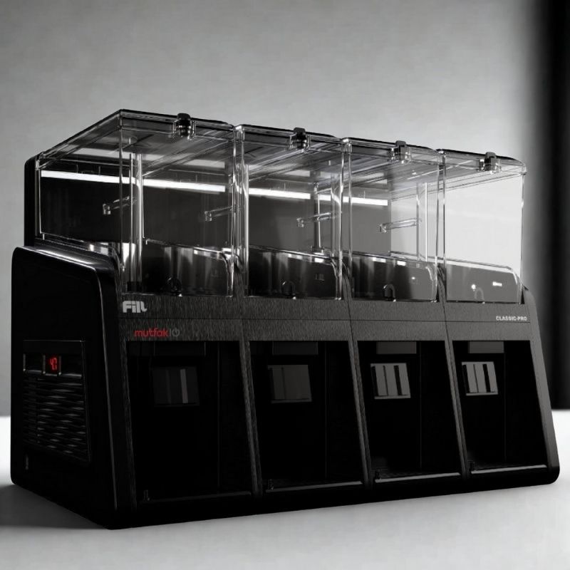 · LED destekli kapalı arka paneli, cihazın arka yüzeyini tamamen kapatarak daha düzenli, kompakt ve profesyonel bir görünüm sunar. Fill Classic Pro, modüler yapısı sayesinde 5’li, 6’lı hatta 10’lu sistemler halinde yapılandırılabilir; bu da onu yüksek kapasiteli mutfaklar için ideal hale getirir.