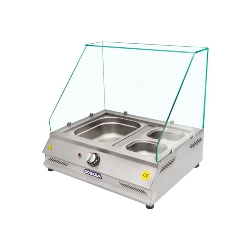 · Paslanmaz çelik gövde · Pilot lamba. Termostat kontrollü (50 °C – 200 °C) · Kolay temizlenebilir. · GN 1/2×100 göre · Garnitür kapları GN 1/6×65 · CE Belgeli. Görkem Set Üstü Sosislik · Ölçüler(cm): 56x46x22 · Güç(kw): 1 · Enerji: 220V-50Hz · Enerji Türü: Elektrik · Ağırlık: 7 kg