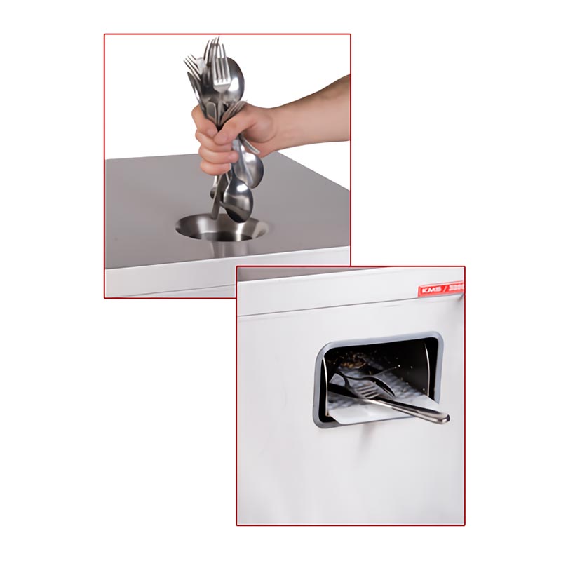 Makinalarımız yıkanmış kaşık, çatal, bıçakların üzerinde oluşan su, sabun ve kireç lekelerini yok edilmesi, kurutulması, parlatılması ve hijyenik bir şekilde servise sunulması için tasarlanmıştır. KMS 7000 Modelimiz, günlük 1000 ile 3000 kişi kapasiteli otel, restoran, catering, üniversiteler, kafeterya ve barlar için tasarlanmıştır. Bir saatte ortalama 7000 adet yıkanmış mutfak takımlarını (kaşık, çatal ve bıçak) kurutur, parlatır ve hijyenik şekilde servise hazır hale getirir KMS takım silme makinaları mutfak takımlarını kurutur, parlatır ve hijyen sağlar!