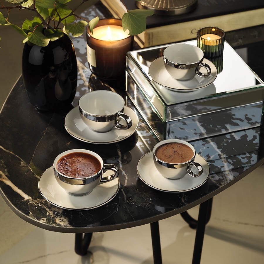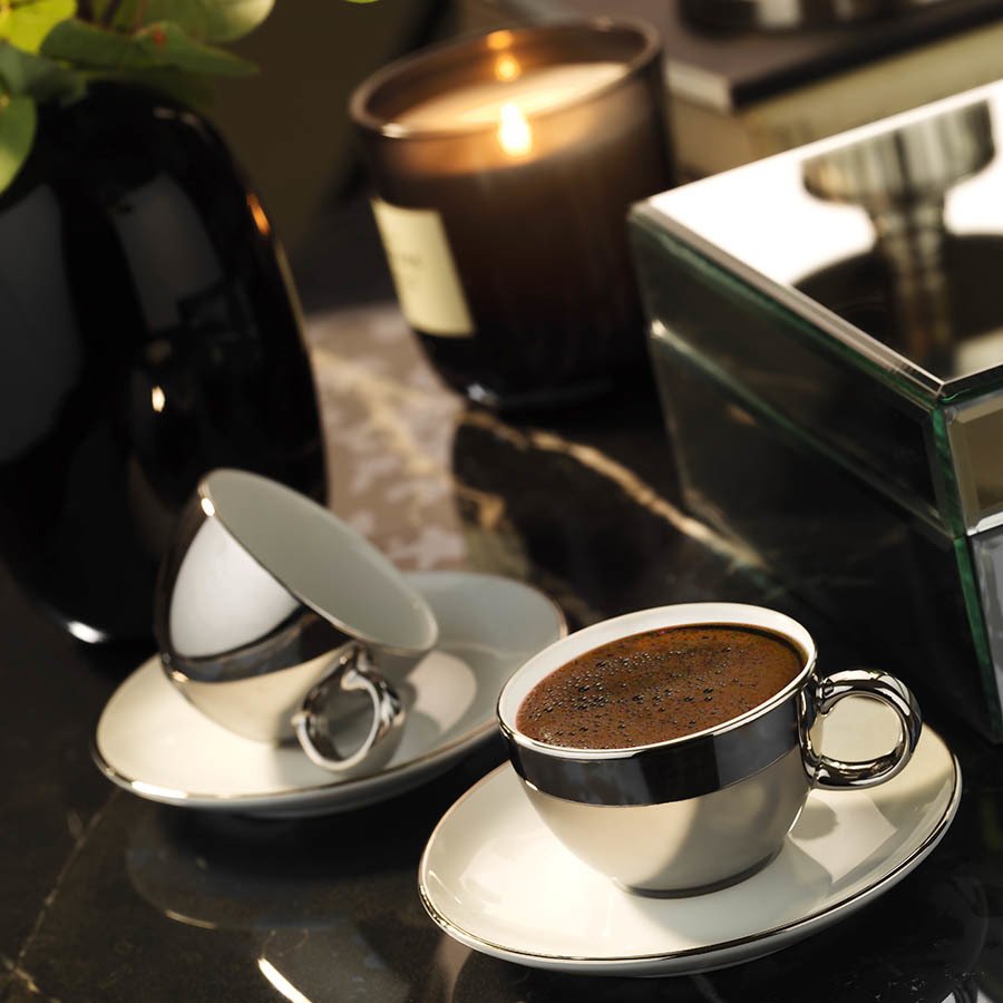 Platinin göz alıcı asaleti sıra dışı desenlerle buluşarak kahve keyfinize eşlik ediyor.