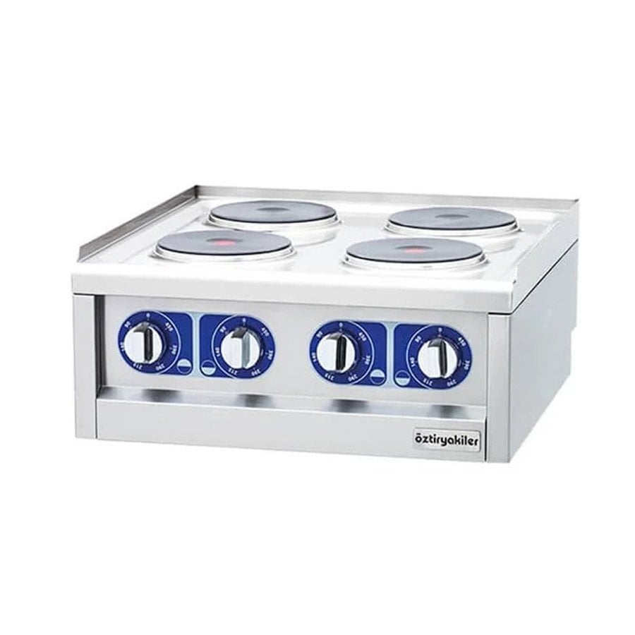 Öztiryakiler 600 Seri Set Üstü Ocak, 4 Gözlü, Elektrikli, 60x60x26 cm Isı plakasında aşırı ısı termiği mevcuttur. Bu termik ısı plakası aşırı ısındığında elektriği keserek ısı plakasının zarar görmesi engellenmektedir ve aşırı ısı ortadan kalktığında sistemi devreye otomatik olarak almaktadır. Her ısı plakasında 90-450 derece arası kontrol edilmesine olanak sağlayan 6 konumlu şalter bulunmaktadır. Bu sıcaklık kontrolü sayesinde kullanıcı pişirme veya bekletme gibi uygulamaları yapabilmektedir. Set üstü ocaklarda pres baskı yöntemi ile özel kalıplar kullanılarak üretilmiş üst tablalar mevcuttur. Üst tabladaki yuvarlatılmış köşeler dayanıklılığı artırmakta ve temizlik kolaylığı sağlamaktadır. Sanayi Tipi Set Üstü Ocak