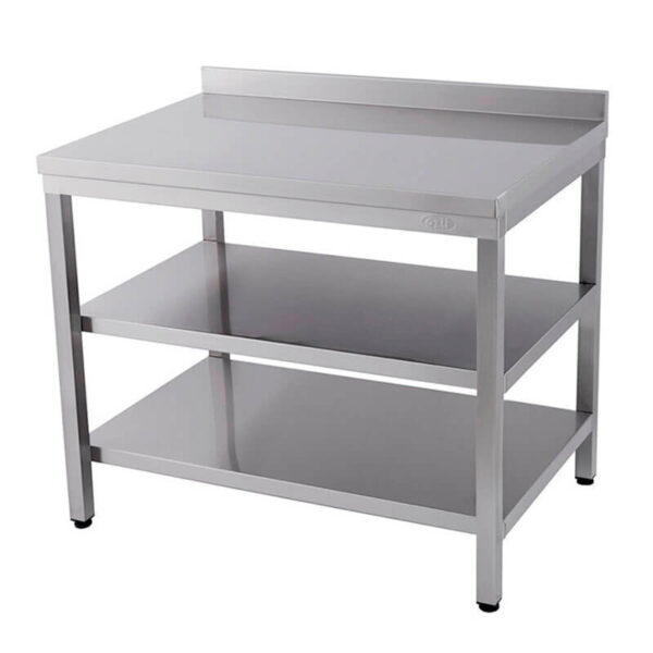 · Üst tabla alınları 40 mm ve sırt 60 mm · Tezgah ayakları 40×40 kutu profil · Paslanmaz çelik taban ve ara raflı · Ayarlanabilir plastik rotil ayaklı Öztiryakiler Ara Raflı Tezgah Teknik Özellikler