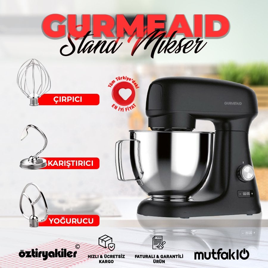 ÖZTİRYAKİLER Gurmeaid Mikser 4.8 Litre 1000 Watt Siyah Öztiryakiler Döküm Gurmeaid Stand Mikser, şık ve sağlam yapısıyla ev ve iş yerlerinde kullanım için tasarlanmıştır. 4,8 litre kapasiteli paslanmaz çelik karıştırma kabı ve güçlü motoru sayesinde çeşitli hamur işleri ve yemek tarifleri için ideal bir seçenektir. Ayrıca, değiştirilebilir aparatları sayesinde farklı işlevleri yerine getirebilir ve işlerinizi kolaylaştırabilirsiniz. Şık siyah tasarımı ve dayanıklı döküm gövdesi ile de mutfağınıza şık bir görünüm katacaktır.