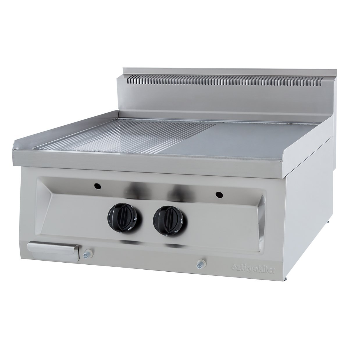Öztiryakiler Grill Plate, Gazlı, Yarı Oluklu, Yarı Düz, 70×65 cm Paslanmaz çelik gövdeye sahiptir. Pişirme yüzeyi 695. 488. 12 milimetre ST 52 çelikten üretilmiştir. Pişirme yüzeyi yarı oluklu, yarı düzdür. Pişirme yüzeyi kenarları sıçrama önleyicilidir. Yağ tahliye çekmeceli. Pişirme yüzeyleri ayrı kumanda edilebilir.  Homojen pişirme yüzeyi sıcaklığı 100-300 °C arasında ayarlanabilir.  Pişirme yüzeyi ısınma süresi 20-200 °C 12 dakikadır. Pişirme zamanı 6 dakikadır. Kapasite Ø100 hamburger için 24 kg/saat. Emniyet ventilli valfli.  Pilot ateşli ve piezoelektrik ateşlemeli.  Ayakların yüksekliği ayarlanabilir. LPG veya doğalgaza uyumlu. Öztiryakiler Grill Plate, Gazlı, Yarı Oluklu, Yarı Düz Teknik Özellikler:  www.mutfak10.com