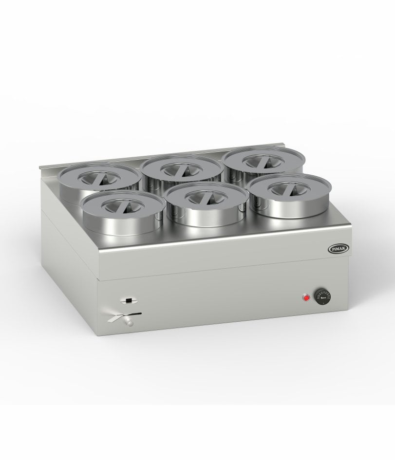 · Termostat kontrollü · Gövde su haznesi paslanmaz çelik · Paslanmaz rezistans ısıtıcılı · Hijyenik, ergenomik konstrüksiyon ve emniyetli Pimak Sos Benmari Teknik Özellikler · Kapasite: 6x 4.5 Litre · Güç: 220 V / 50-60 Hz / 2 kW · Ölçüler: 72x65x35 Cm · Ağırlık: 22 Kg