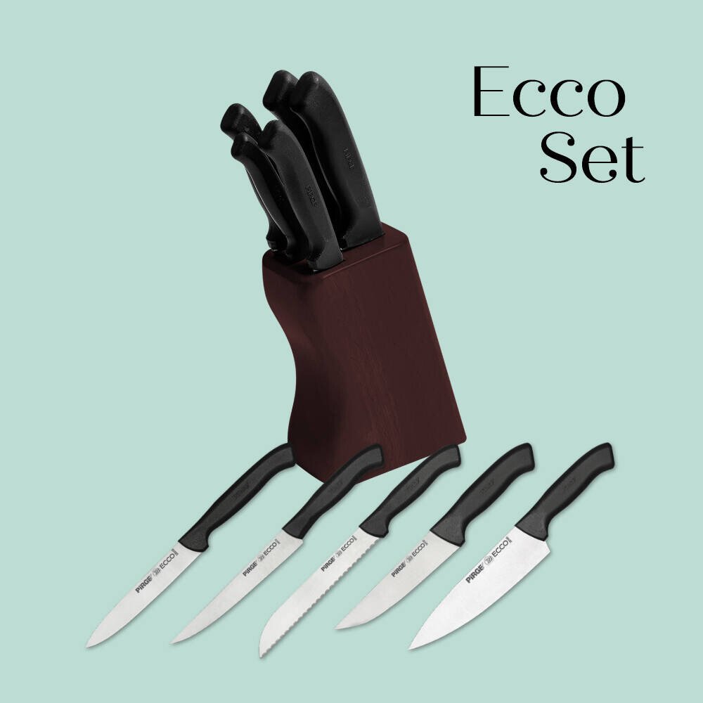 38410 – Ecco 5 parça bıçak seti: içinde mutfağınızdaki temel bıçak ihtiyaçlarınızı karşılayabileceğiniz 5 bıçak ve bu bıçakları muhafaza eden doğal kayın ağacından bir blok