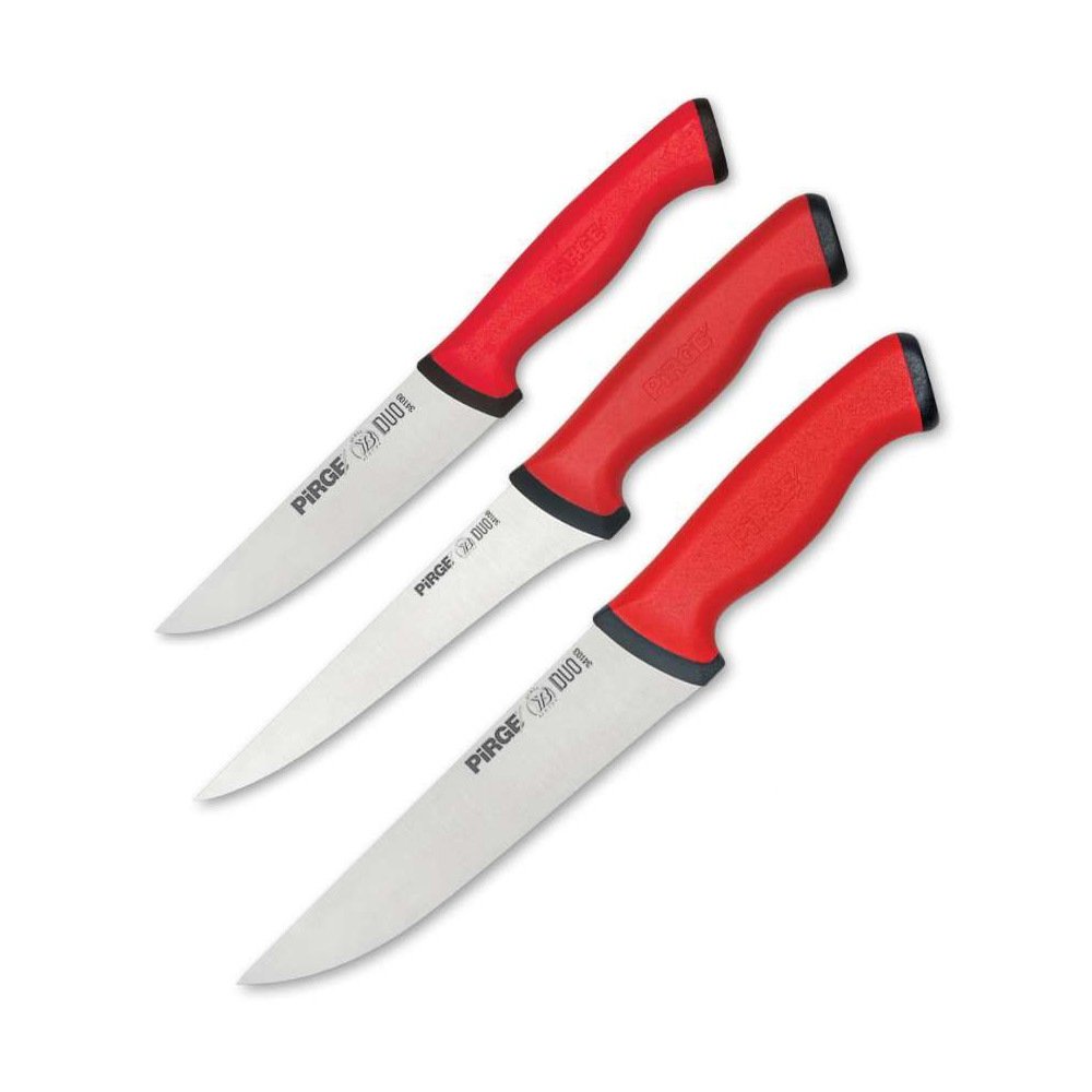 Pirge DUO Serisi, profesyonel şeflerin ve profesyonel kasapların özellikle et sıyırma, dilimleme, doğrama ihtiyaçlarını karşılamak için kaymaz sap teknolojisiyle üretilmiş performans bıçaklarıdır. Pirge’ye özel yüksek karbonlu, molibden ve vanadyum alaşımlı Fransız konik çeliklerin kullanıldığı DUO serisi bıçaklar, Pirge P+ keskinlik ömründedir. Buzul ısıl işlem uygulanarak üretilen DUO serisi 5 yıl paslanmazlık garantilidir. DUO serisi kaymaz sap teknolojisiyle üretilmiş, sap içindeki uzun çelik boyu ile sağlam ve güvenli bir tutuş sağlamaya yardım eder. Elden kaymayan saplı, yüksek performanslı, profesyonel kalite et bıçaklarını kullanmak için DUO serisini tercih edebilirsiniz. Kurban bayramında et kesme işlerinizi kolayca yapmanızı sağlayacak DUO Profesyonel Kasap Kurban Bıçak Seti 3’lü ile evinizde ve işinizi bıçak ihtiyacınızı profesyonel kalitede karşılayabilirsiniz. 12,5 cm küçük boy et bıçağı ile etleri doğrayabilir, derileri yüzebilirsiniz. Günlük mutfak bıçağı ihtiyacınız için de kullanabilirsiniz. 14,5 cm sıyırma bıçağı ile eve kemikli gelen etleri kemiklerinden ve sinirlerinden kolayca sıyırabilirsiniz.19 cm büyük boy et bıçağı ile Kurban kesebilir, büyük parça etleri küçük parçalar haline getirebilirsiniz. Sağlam çelik yapısı ile büyük sebzeleri, meyveleri kesmek için de kullanabilirsiniz.
