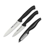 Mutfakta profesyonelliğe ilk adımı atmaya hazırlananların tercihi, sade tasarımlı, sağlam, paslanmaz, keskin bıçaklar. Soyacak ile domates, patates, elma gibi kabuklu ürünleri kolayca soyabilir, Sivri 9 cm bıçak ile kabuklu ürünleri temizleyebilir ve doğrayabilir, Dişli bıçak ile domates gibi sert kabuklu sebzeleri dilimleyebilirsiniz. Set içindekiler: