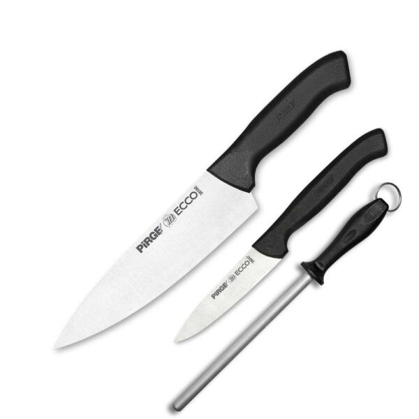 Pirge Ecco Şef Başlangıç Bıçak Seti – 35083 Mutfakta profesyonelliğe ilk adımı atmaya hazırlananların tercihi, sade tasarımlı, sağlam, paslanmaz, keskin bıçaklar. Ecco Şef Başlangıç Bıçak Seti ile evinizde ve işinizde bıçak ihtiyacınızı profesyoneller gibi karşılamaya başlayabilirsiniz. Sebze bıçağı ile tüm soyma işlerini, Şef bıçağı ile kesme, dilimleme ve doğrama işlerini yapabilirsiniz. Ev Tipi Oval Masat ile bıçağını her gün keskin tutabileceksiniz.