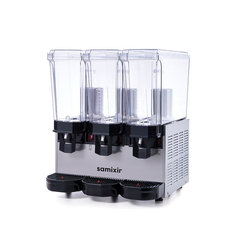 Samixir 60.SSSI Klasik Triple Soğuk İçecek Dispenseri, 20+20+20 L, Fıskiyeli, Inox Manyetik fıskiyeli karıştırma sistemi sayesinde; parçacıksız meyve sularının, şalgamın soğutulması ve dağıtılması için üretilmiş tezgah üstü dispenser. Manyetik pompa sayesinde hazne içinde bulunan meşrubatın alt motor bölümüne sızma riski ortadan kalkar, bu sayede motorun ömrü uzar. Geniş soğutma tabanı sayesinde ayran daha hızlı ve son damlasına kadar eşit olarak soğur, bu sayede diğer ürünlere göre %50’ye varan güç tasarrufu sağlar. Parçacıklı içeceklere uygun değildir. Fıskiye sistemi sayesinde iştah açıcı görsellik sunar. Çoklu hazne sayesinde kesintisiz içecek temini sağlanabilir. Pratik musluk sistemi; tek el kullanılarak rahatça içecek alabilmeyi sağlar. Geniş musluk hortumu devamlı akışkanlık sağlar ve basitçe sökülüp temizlenebilir. Kusursuz temizlik ve hijyen için içecekle temas eden parçalara kolayca ulaşılır ve hızlı bir şekilde temizlenebilir. Polikarbonat hazne darbeye dayanıklı ve gıda kullanımına uygundur. Kompakt gövdesi sayesinde yüksek miktarda günlük tüketime sahip tesislerin ihtiyaçlarını karşılar. Damlalıkta bulunan seviye göstergesi sayesinde atık suyun taşmadan önce boşaltılması gerektiği rahatça fark edilir. Isı seviyesi manuel olarak gövde içinden ayarlanır, termostat bu ayarı korur. Samixir 60.SSSI Klasik Triple Soğuk İçecek Dispenseri, Fıskiyeli, Inox Teknik Özellikler: