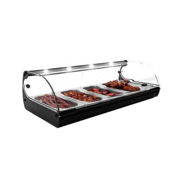 Sayl Self Servis Bano Maria CSS4L Sıcak Teşhir Ünitesi Led aydınlatmalı. Müşteriye direk sıcak teması önlemek amaçlı özel tasarım. Self servis imkanı sağlayan her iki taraftan açılır kapılar. Kolay temizlenebilir. Teknik Özellikler Kapasite: GN 4 x1/3-40 Aydınlatma: Led Erişim: Ön ve Arka Açılır Kapı: 2 Ön/ 2 Arka lsı / Kuru: +80 Voltaj /Güç: 230V / 800W Net Ağırlık: 15 kg. Paket Ağırlık: 25 kg. Net Ölçüler: 840x395x245 mm