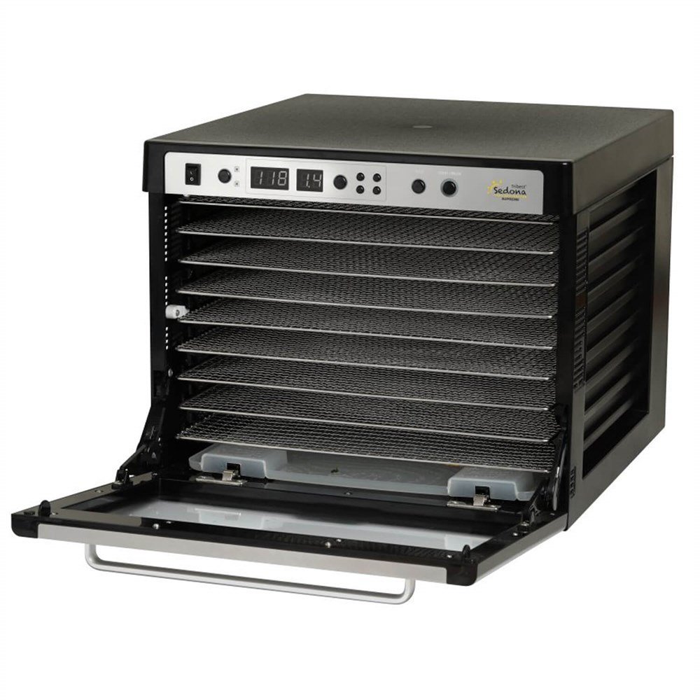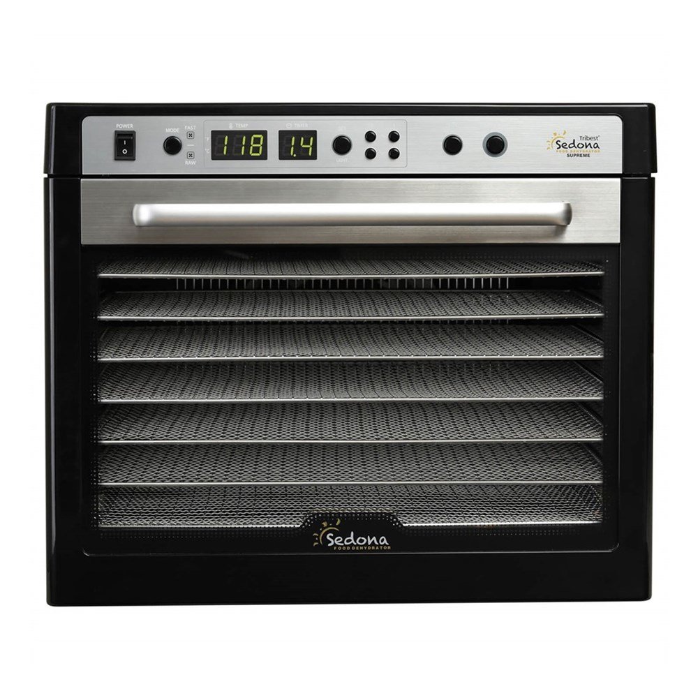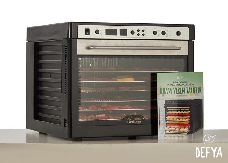Tribest Sedona Supreme Meyve Ve Sebze Kurutma Makinesi Tribest firmasının son ürünü Sedona Supreme Mutfak10.com aracılığıyla sizlerle buluşturyoruz. Kurutma makineleri elmalardan kabaklara, ekmeklerden ezmelere ve krakerlerden -et de dahil- her türlü kurutulmuş yiyecek tariflerinize kadar, tüm kurutma ihtiyaçlarınızda kullanabilirsiniz. Kurutma derecesinde tam kontrol Sedona Supreme, iki aşamalı ardışık sıcaklık zamanlayıcısı ( TST ) özelliğine sahip olduğundan dolayı iki aşamalı kurutma yapabilirsiniz. Bu iki aşamalı kurutma size özellikle domates ve turunçgiller gibi kurutma işlemine yüksek sıcaklıkta başlanması gereken yiyeceklerde ısının verimli şekilde ayarlanmasına olanak sağlar. Geniş kapasite – Akıllı tasarım Aynı anda birden çok ürünü kurutabileceğiniz 9 adet paslanmaz çelik rafın toplam alanı 1.18 m2 dir. Ünitenin ön tarafında bulunan cam bir pencereden, iki adet iç LED ışık sayesinde kurutma işlemini engellemeden gıdalarınızı izleme rahatlığını da sunmaktadır. Tüm kontroller dijital kontrol paneli üzerinden yapıldığı için hem kuruttuğunuz dereceyi tam olarak kontrol edersiniz hem de süreyi. Tarifleriniz Amerika ya da İngiltere’den ise ˚F, diğer ülkelerden ise ˚C derece opsiyonunu kullanabilirsiniz.