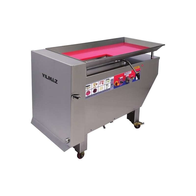 Motor gücü ;Çift motorlu;2 Hp 1,5 Kw 400Volt 50 Hz.(hidrolik motor) Kapasite ;Minimum : 800 kg/saat Ebatlar; En : 690 mm Boy : 1640 mm Yükseklik : 1055 mm Net Ağırlık ; 265 Kg Kare Bıçak yatak ölçüleri; 7,5mm – 16mm – 24.5mm – 33 mm Kuşbaşı makinası et kesme dışında, patates, salatalık, havuç vb. gibi sert sebzeleri kesmede de kullanılabilmektedir. Hazneye doldurulan et veya sert cisimli sebze makinanın et çıkış haznesindeki bıçak sistemi sayesinde kuşbaşı parçaları halinde çıkar, ayrıca ön boy kesme bıçağıyla boy kesmesi yapılmaktadır. Kuşbaşı makinasının bıçak sistemi aşağı yukarı ve aynı zamanda sağa ve sola doğru hareket ederek, itici pistonun öne doğru bastığı et haznesindeki soğuk et ve sert cisimli sebzeleri istenen ölçüde keserek ön kesici bıçak sayesinde boy kesme yapmaktadır. Hazneye doldurulacak olan kemiksiz etin sıcaklığı 0 ile – 5 derece arasında olmalıdır. Makinadaki dış gövde birimleri ve tüm bağlantı ve ekipmanları 304 kalite paslanmaz çeliktir. Makina üzerinde minimum 100 x 100 mm kare bıçak yatağı bulunmaktadır. Makina'nın hazne uzunluğu 550 mm’dir. Makinanın bıçak yatağında kızıl malzeme kullanılmıştır. Makinanın üzerinde 304 kalite paslanmaz boy kesme bıçağı bulunmaktadır. Makinanın boy kesme bıçağı da çıkartılabilmekte ve dilerseniz dikdörtgen kesim de yapılabilmektedir. Makinada bulunan piston ve hız ayarları ile kullanacağınız sert cisimli sebzelerin boyutları istenen uzunluğa göre ayarlanabilmektedir. İnsan sağlığı ve çalışma güvenliği düşünülerek üst itici piston kapağı ve bıçak sisteminin bulunduğu ön kapak açıldığı takdirde makinaya gelen elektrik akımı özel görücüler sayesinde devre dışı kalarak kesileceğinden makinanız çalışmayacaktır. Üst hazne kapağı ve ön bıçak kapağı kapatıldığında makina kaldığı yerden çalışmaya devam edecektir. Makinada ilk işleme başlamadan önce elektrik kablosu fişe takılarak şalteri 1 (bir ) konumuna getirilir. Üst et haznesine et yüklemesi yapıldıktan sonra üst kapak kapatıldığında makinanız otomatik olarak çalışmaya başlayacaktır. İlk işlemde itici piston en arka konumda durmuş olup et yüklemesi yapılıp, üst kapak kapatıldıktan sonra itici piston otomatik olarak öne doğru baskı işlemini başlatır. Hazne içindeki malzemeyi ön kesici bıçaklara taşıdıktan sonra ön görücü sayesinde hızla en arka konuma gelerek manyetik göz sayesinde elektriğin kesilmesi sağlanır. Yeniden üst kapağı açarak et yüklemesine devam edilir tüm çekim işlemi bitirildiğinde şalter 0 (sıfır) konumuna getirilir. Ve böylece elektrik bağlantısı kesilerek temizlik işlemine hazır hale getirilir. Kapasite dk / 8 Kg KUŞBAŞI MAKİNASI ET KESME UZUNLUK BOY AYARI; ( 0 ile – 5 derece arasındaki ürünler için) PİSTON HIZI BIÇAK HIZ AYARI ET UZUNLUK 2,5 8 1,5 cm 3 8 2 cm 3 7 2,5 cm 4 7 4,5 cm